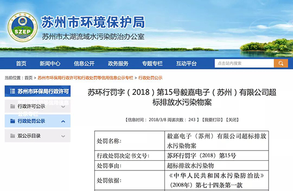值得一提的是,毅嘉电子(苏州)有限公司自2014年至今,每年都有不良环境监管记录,苏州市环境保护局官方网站信息显示,该公司在2018年3月还因超标排放污水被苏州市环保局依法处罚。