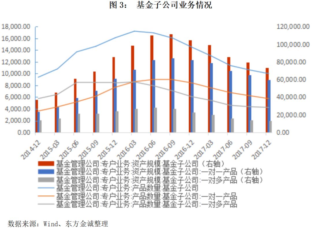 2012年9月,监管机构发布《关于实施〈基金管理公司特定客户资产管理业务试点办法〉有关问题的规定》,开启了基金子公司发展的序幕。成立之初,基金子公司仅有不低于2000万元的注册资本要求,没有风险资本和净资本的约束,且除了不能直接发放贷款以外,几乎没有业务限制。相比当时已逐步受资本金等约束的信托和券商资管,基金子公司在通道业务上占据了极大的优势地位,其规模快速膨胀。资产规模在2016年9月达到峰值11.15万亿。此后,随着“八条底线”、净资本要求、风险控制指标管理等的落地,基金子公司资产规模一路下滑。截至2017年末,基金管理公司子公司专户规模7.4万亿元,比2016年底缩水3.10万亿元。