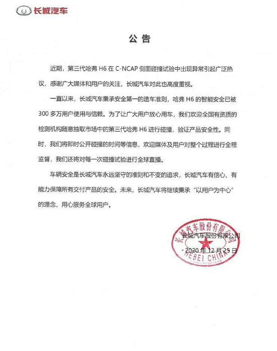 12月25日,长城汽车发布官方公告,欢迎全国有资质的检测机构随意抽取市场中的第三代哈弗H6进行碰撞,验证产品安全性,并且还会随时公开碰撞的时间等信息,让媒体和用户对碰撞过程全程监督,长城汽车会对每一次碰撞试验全球直播,这则公告也展现出长城汽车、哈弗对第三代哈弗H6安全性的自信和底气。