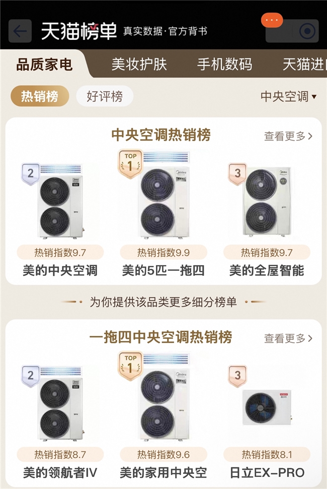 美的中央空调在天猫双十一登顶品类热销榜榜首!在天猫中央空调热销榜上,美的5匹一拖四高居榜首,美的中央空调、美的全屋智能分列二、三位;一拖四中央空调热销榜中,美的家用中央空调、美的领航者IV更是包揽前两名。这一亮眼成绩,充分彰显了消费者对美的品牌的高度认可,尤其是其“一价全包”服务承诺,通过打破行业价格不透明的痛点,成功推动了销量增长与消费体验升级。
