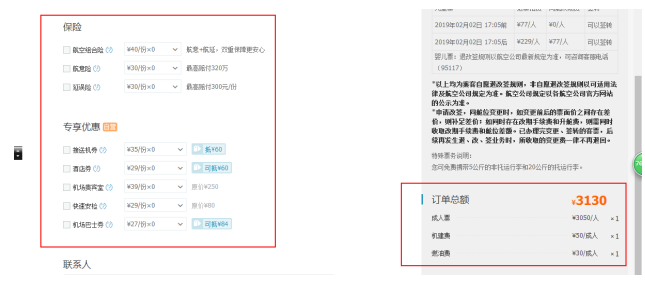 在去哪儿网上,体验人员发现搜索结果为相应的机票和票价,点击“预订”进去后的机票总价是成人票+机建费50元+燃油费30元,总价构成清晰醒目。该页面虽然有“+29元服务包”,“¥40/份航意险”,“¥30/份延误险”,“¥30/份接送机券”,“¥39/份快速安检”,“¥29/份机场巴士券”等保险和专享优惠服务选项,但均可供消费者自己选择,没有默认勾选。如下图: