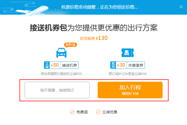 另一种选项是普通预订,点击“预定”后弹出一个接送机券包页面(如下)。这个页面如果消费者不仔细看,很容易点击平台用显著深色突出的“加入行程”入口,而点击这个入口是要加收38元服务费的。虽然旁边有“我不需要,继续预订”入口,但这个入口不仅用了不显眼的淡灰色,而且字号也非常小。